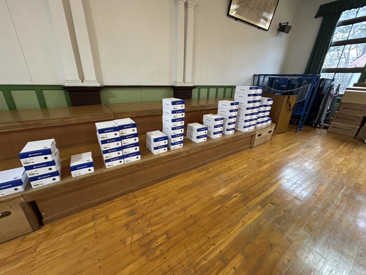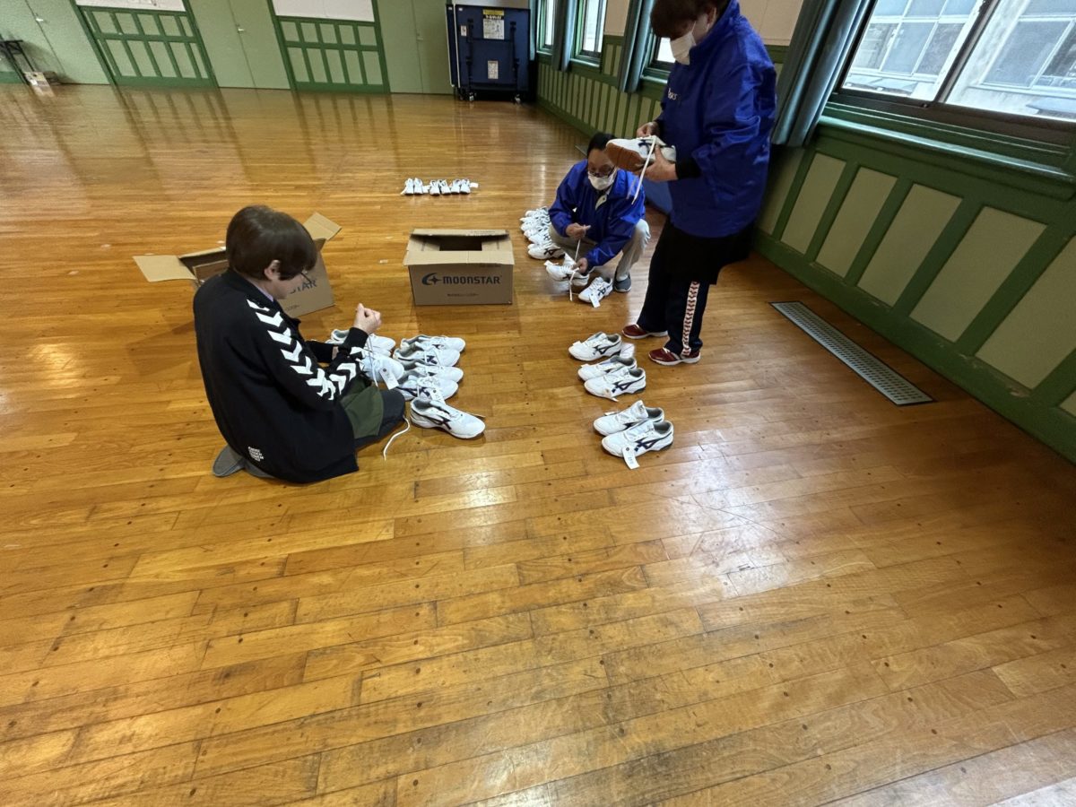 去る2026年3月25日、弊社スタッフは山形県立寒河江高校(場所は講堂にて)へお邪魔し、今春ご入学を予定されている新入生の皆様に向けた「内シューズ(校内履き)」の注文・販売会を実施いたしました。