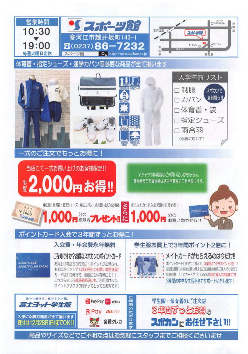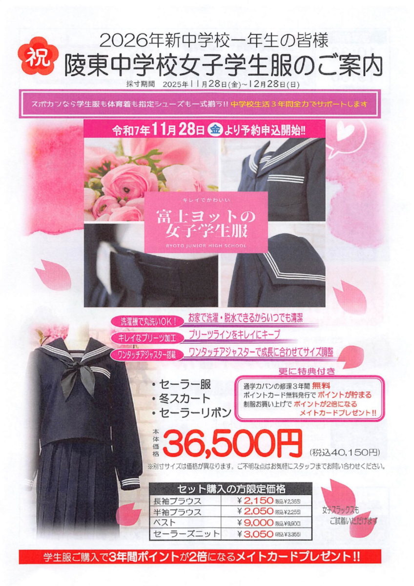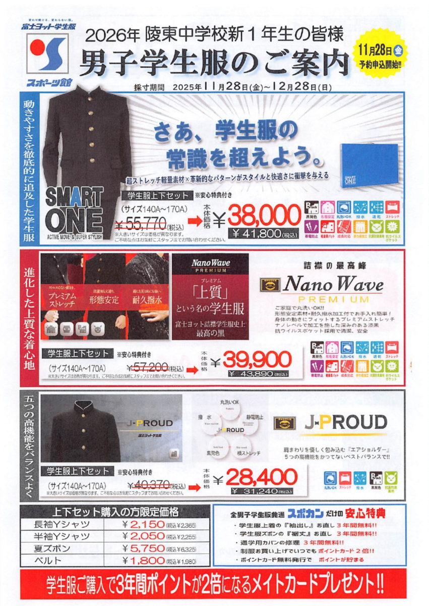 当店では、寒河江市立陵東中学校にご入学される新1年生の皆様を対象に、学生服・体育着等の販売予約申し込み受付を開始いたしました。