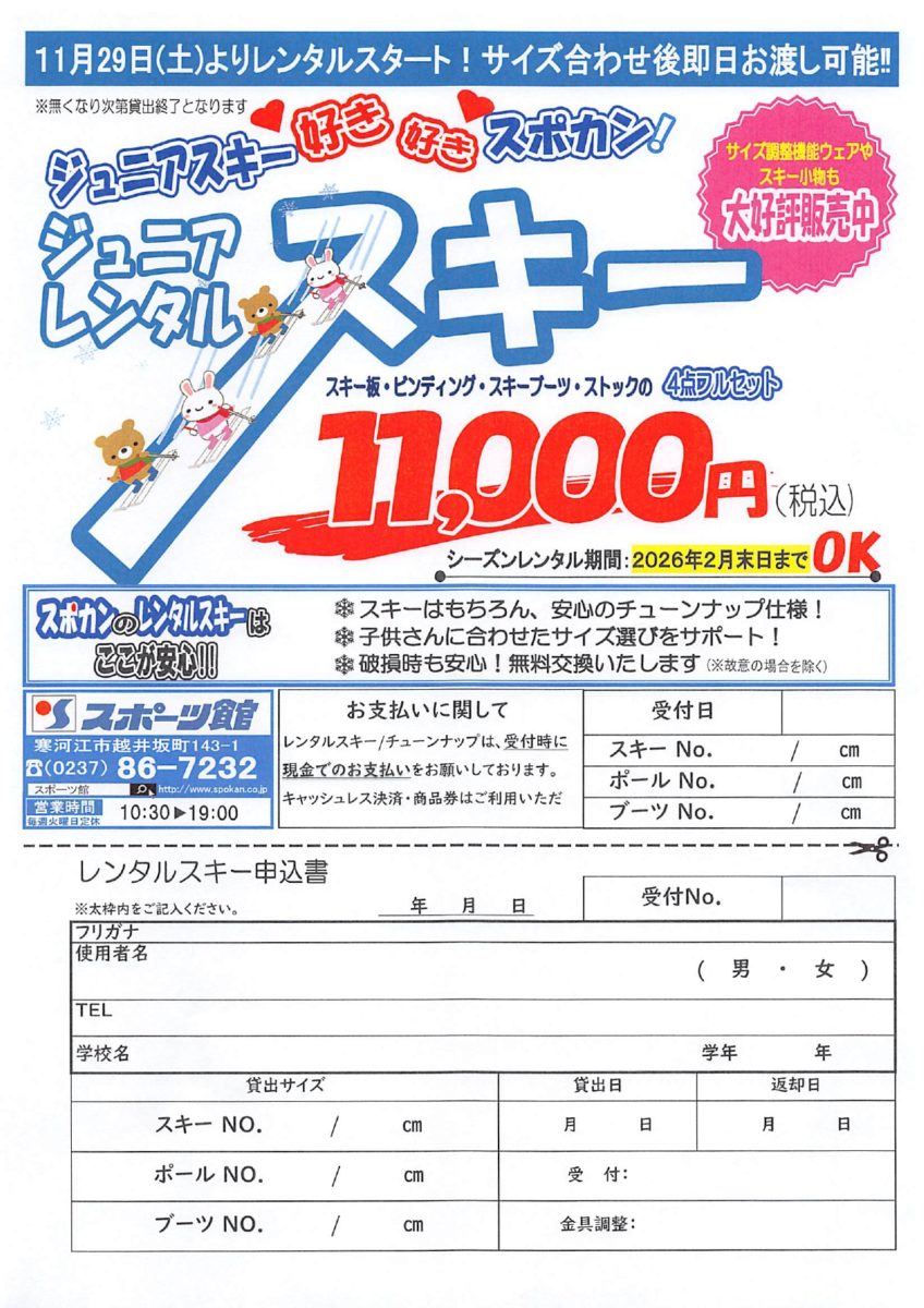 日頃より当店スポーツ館をご利用いただき、誠にありがとうございます。例年ご好評いただいております、ジュニアスキーのレンタル申し込みを、今年も以下の通り受付開始いたします。