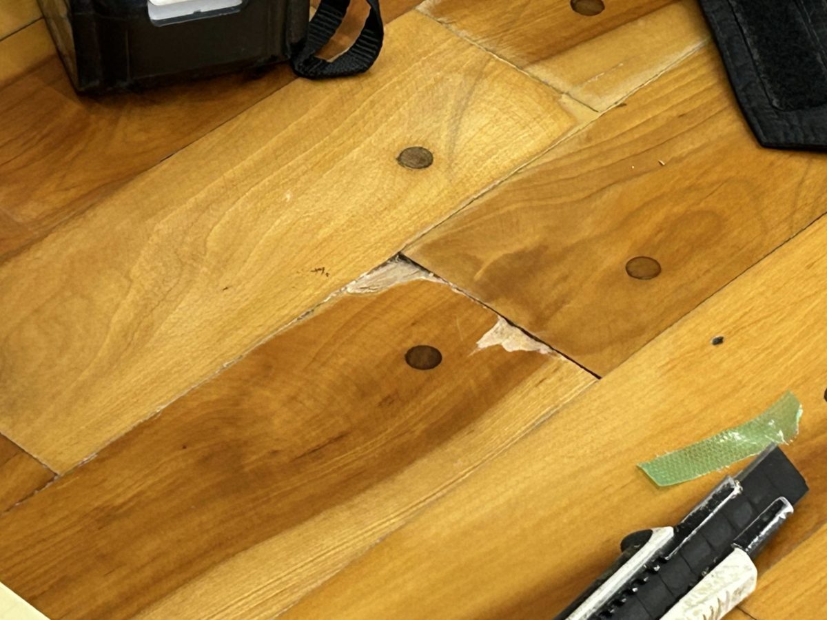 長年の使用による劣化で、床板の一部に破損が見られました。 踏み込みの激しい剣道場において、床のささくれや割れは怪我に直結する重要なポイントです。