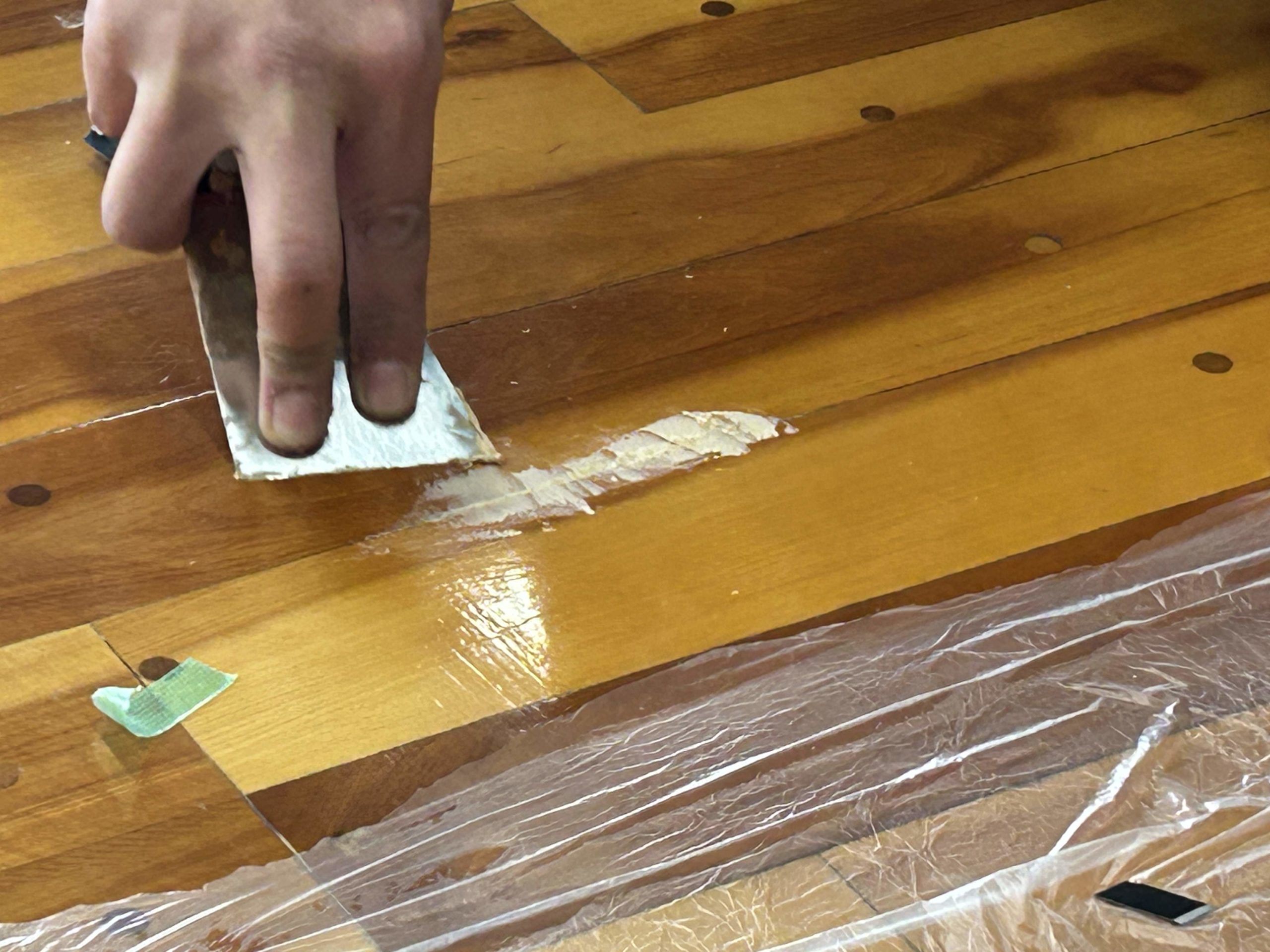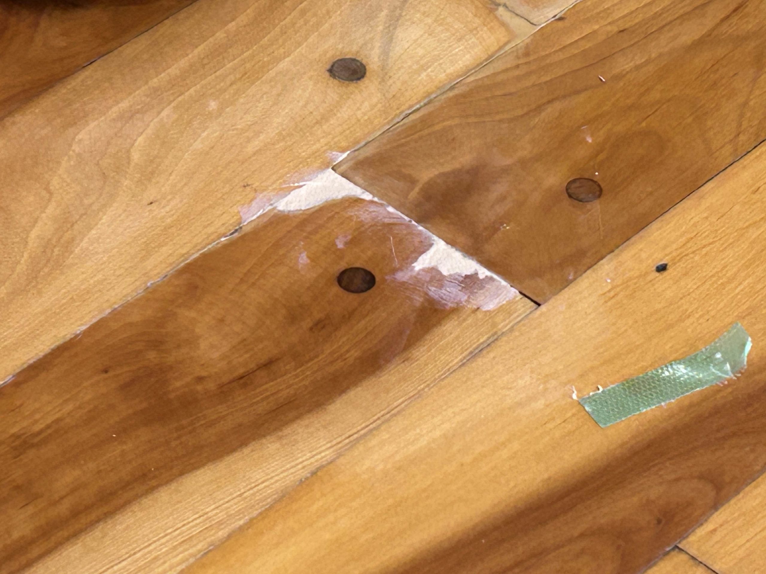 冬場の必需品である「ジェットヒーター」ですが、不注意により床板に焦げ目が生じてしまった箇所の修繕を行いました。