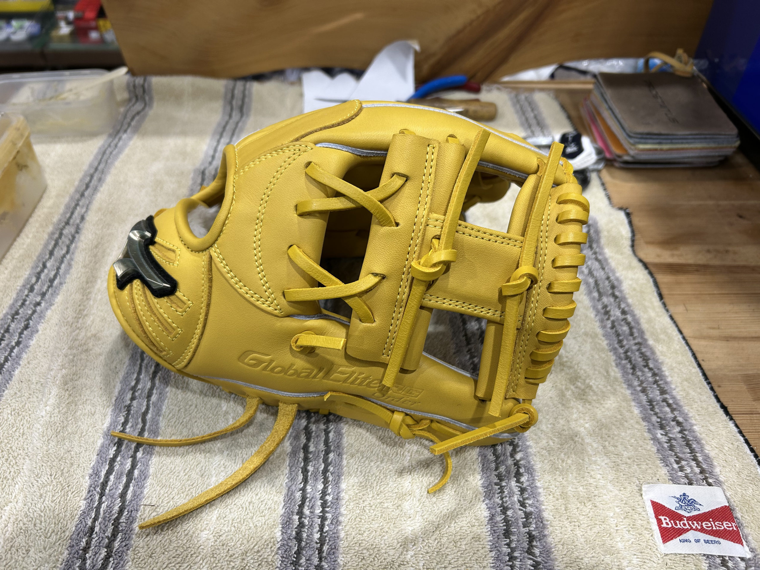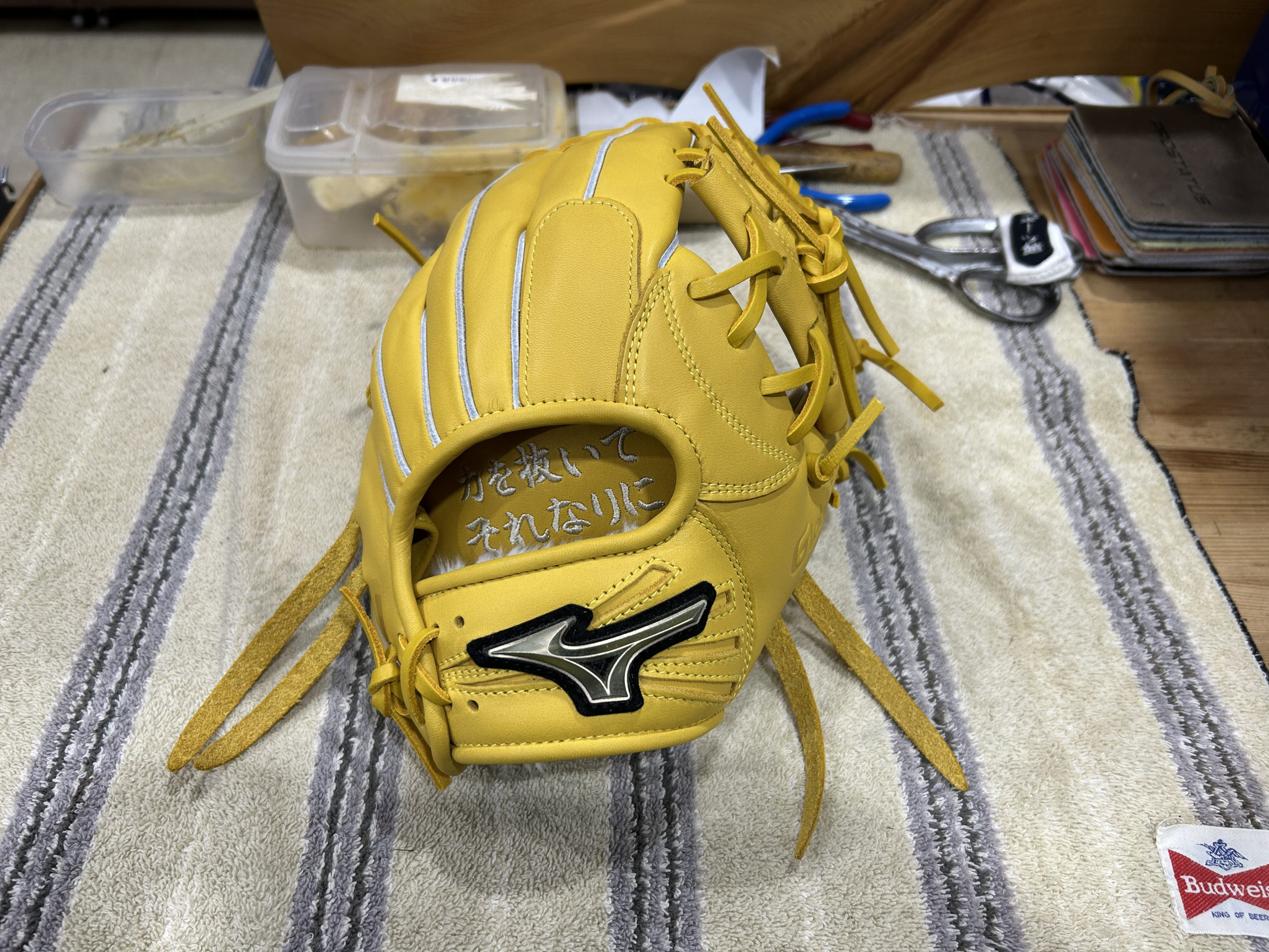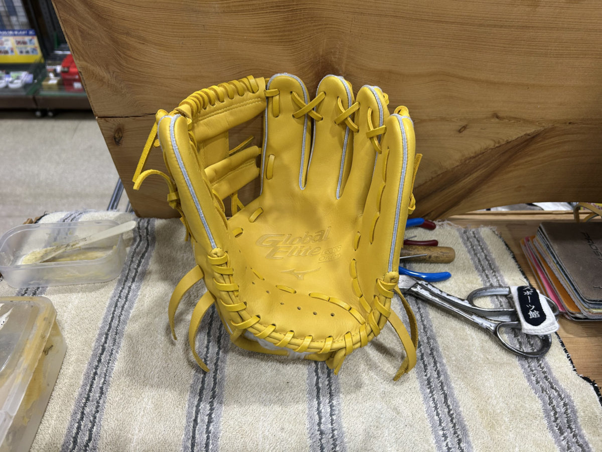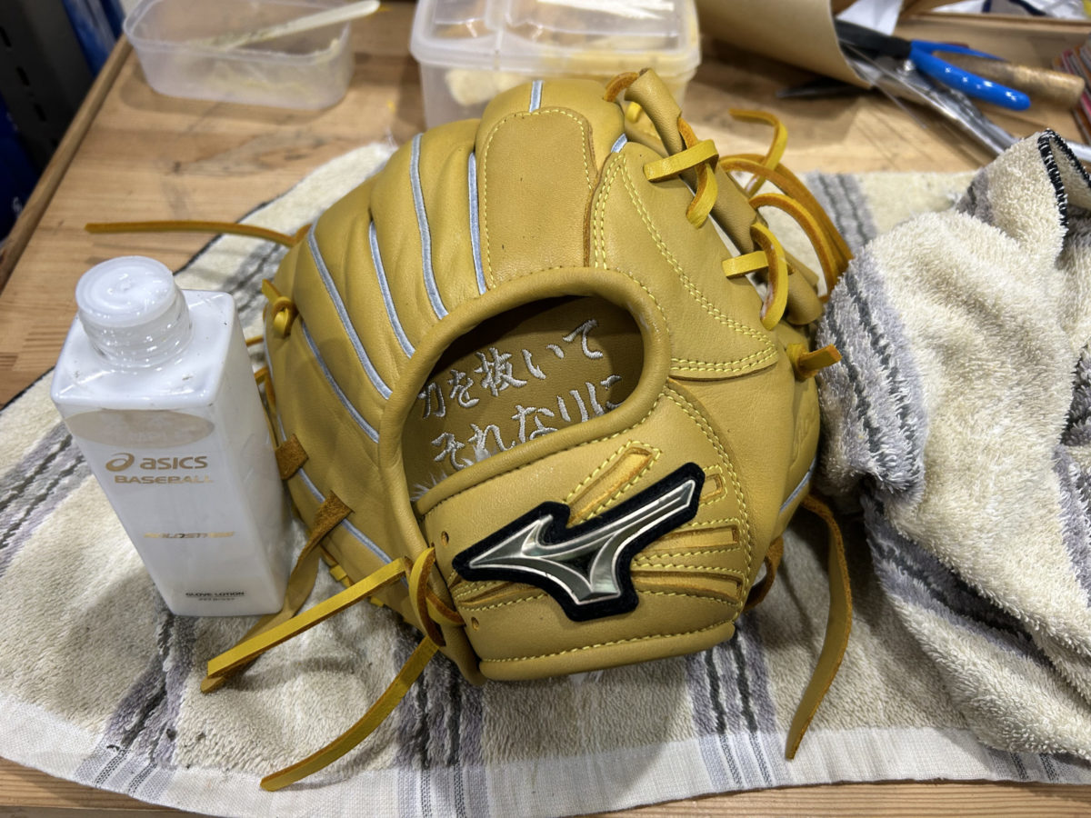 野球という競技において、時に肩に力が入ってしまう子どもたちへ送る、優しくも深いメッセージです。この言葉を常に手に触れるグローブに入れることで、お子様がプレー中にリラックスし、楽しむことを思い出せるようにという親御さんの願いが込められているのでしょう。私たちも、その温かい思いに応えるべく、丁寧に型付けを行いました。まずは外観のチェックをします。ミズノ・グローバルエリートです。皮質が良く、品質の高いグローブで、やや硬めです。