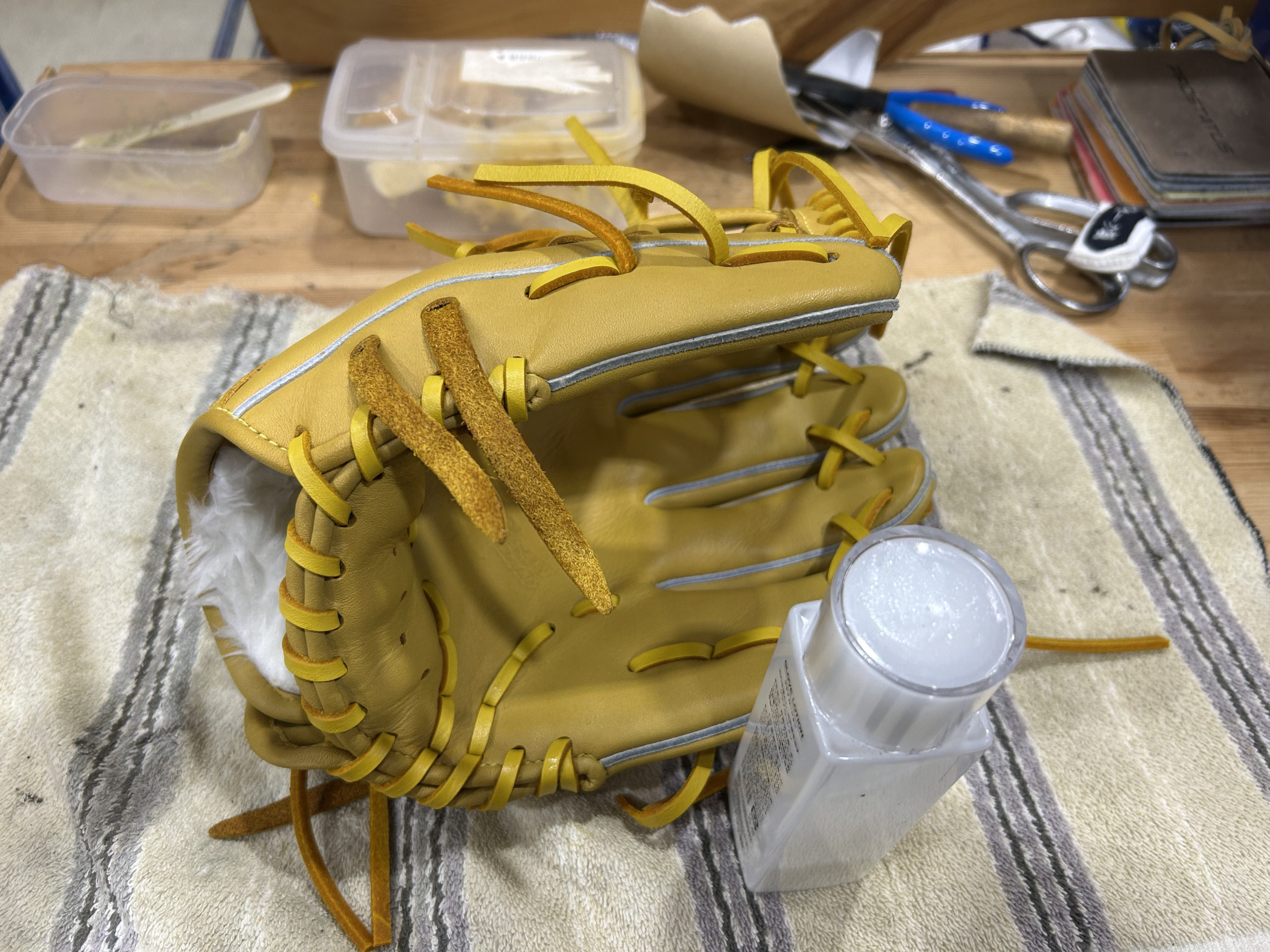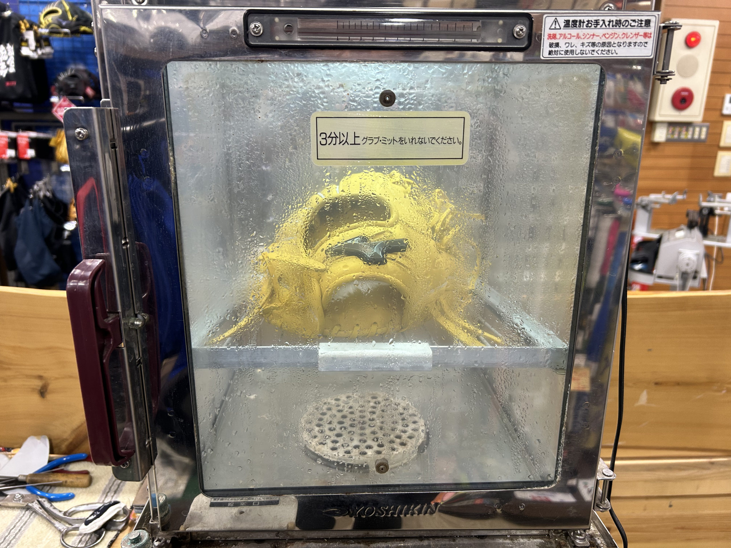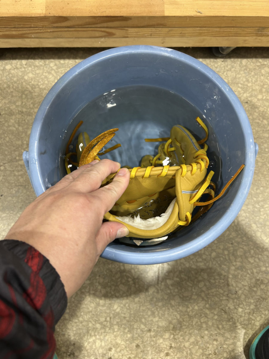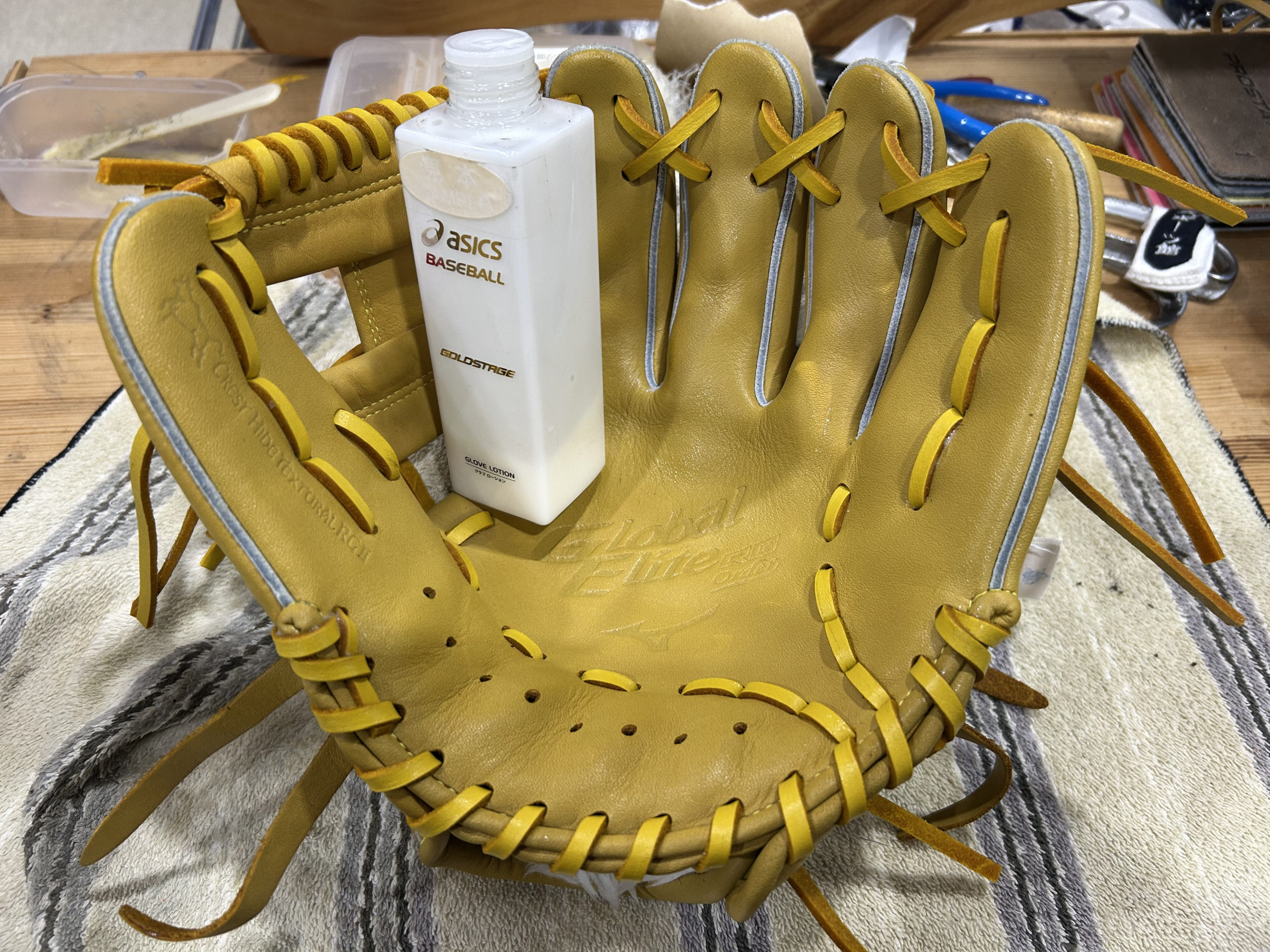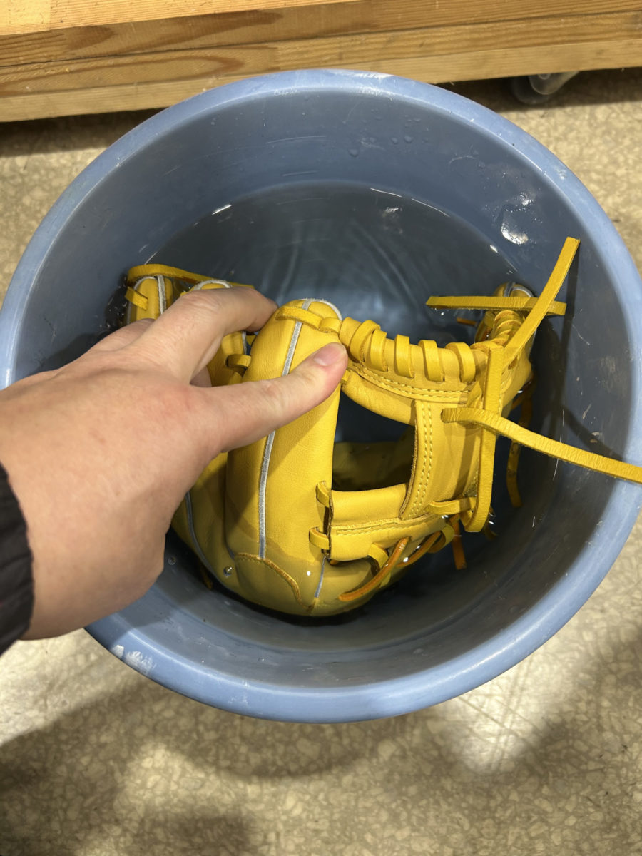 今回ご依頼いただいたジュニアグローブは、まさにこの例外にあたります。握力が少ないお子様にとって、硬すぎるグローブは捕球の妨げになり、かえって野球が難しくなってしまう可能性があります。そのため、捕球の楽しさを最大限に引き出せるよう、今回は特別な配慮として「湯もみ」を施し、すぐに試合で使える柔らかさに仕上げました。スチームで加温・加湿しましたが、湯もみを選択しました。お湯(40℃から60℃)に付けた後は、ローションで保湿します。皮が乾燥してカサつくのを防ぎます。
